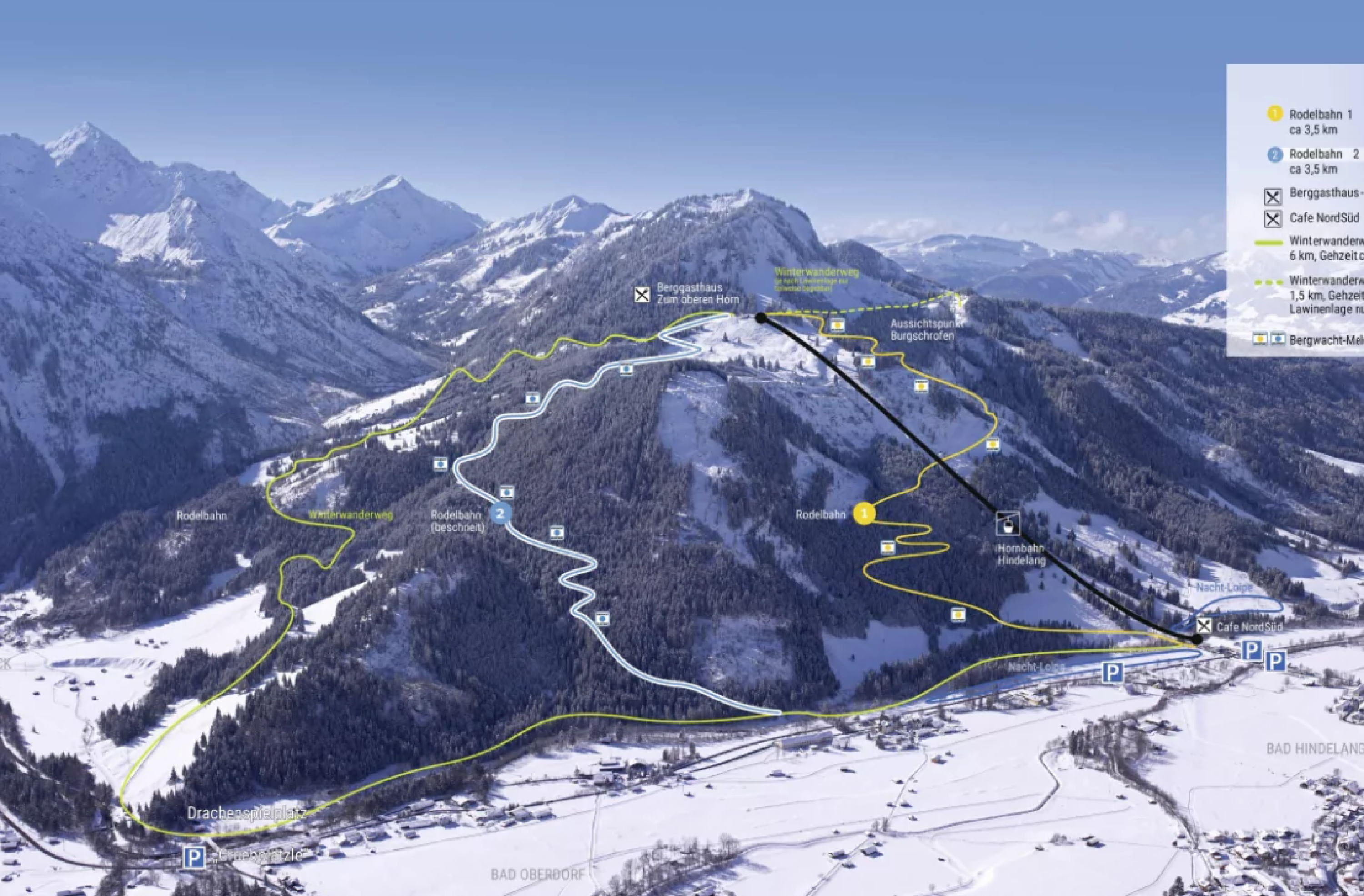 Direkt an der Bergstation der Hornbahn Hindelang beginnt der traumhafte Panorama-Winterwanderweg. Bevor ihr euch aber auf den Weg macht, solltet ihr unbedingt den wunderschönen Blick aufs Ostrachtal bei einem kleinen Getränk an der Berggaststätte "Zum Oberen Horn" genießen. Der Weg führt meist parallel zur roten Rodelbahn in Richtung Osten. Besonders schön ist die abwechslungsreiche Landschaft entlang des Weges. Teilweise geht es durch den verschneiten Winterwald, andererseits öffnet sich immer wieder der bezaubernde Panormablick zum Tal. Eine Alternative zum Winterwanderweg ins Tal ist der Weg zum Aussichtspunkt Burgschrofen mit Blick aufs Ostrachtal und ins Illertal bis zur Hörnergruppe. Da dieser Weg nicht maschinell präpariert ist, sollten Wanderer sich vorab über den Schneebericht der Hornbahn Hindelang informieren.